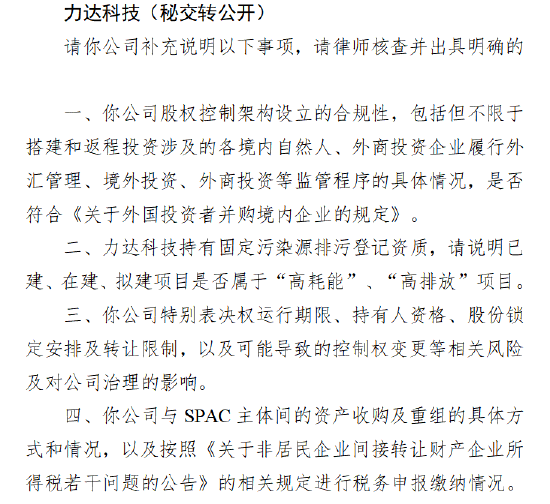 力达科技(秘交转公开)近日收到中国证监会关于其本次境外发行上市的备案反馈意见,证监会要求公司就股权控制架构合规性、“两高”项目属性、特别表决权风险及SPAC相关税务申报等四大事项补充说明,并由律师核查出具明确法律意见。